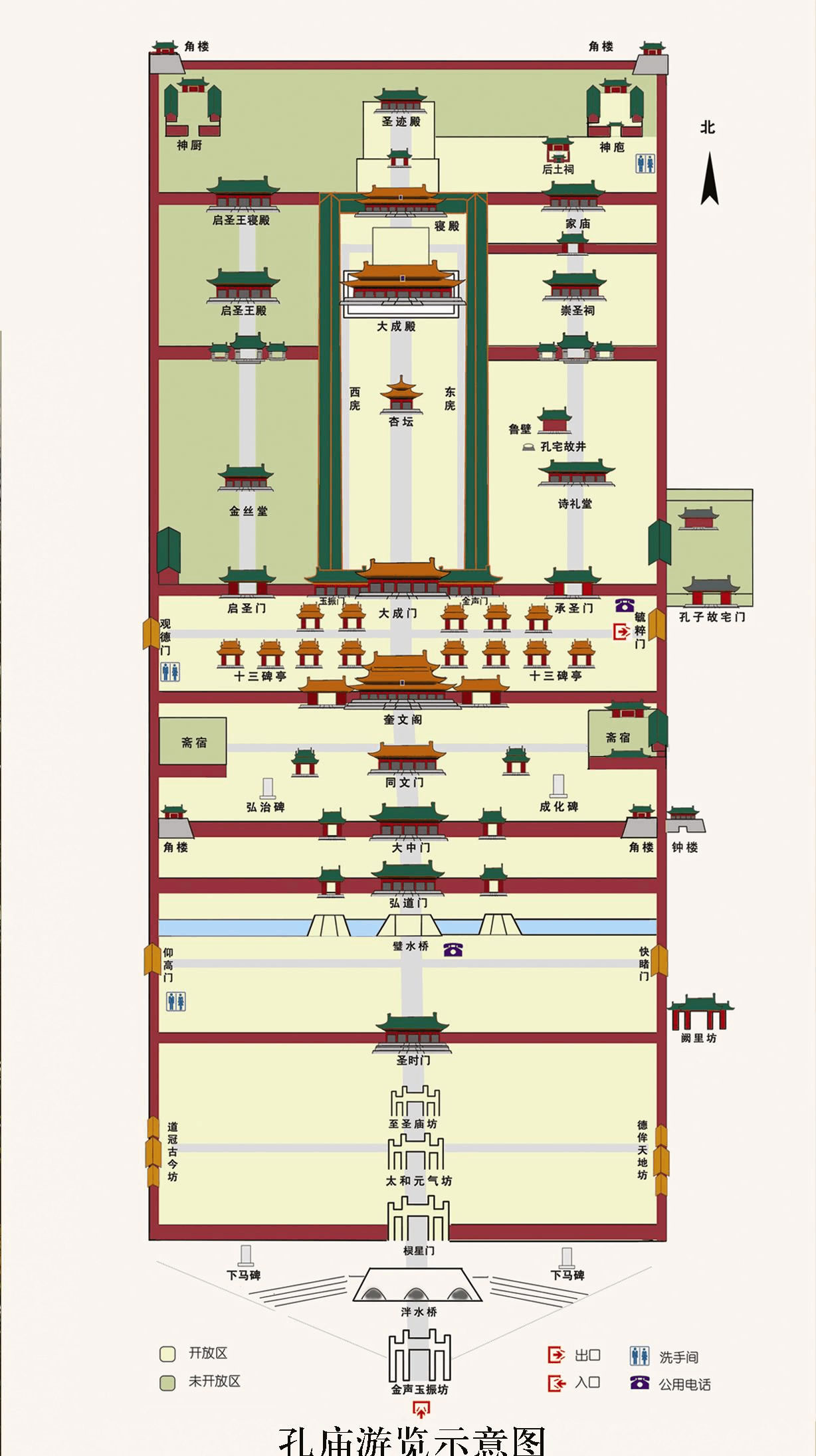 橋南東西二門,甬道相連,東匾“快睹門”,取李渤“如景星鳳凰,爭先睹之”語,即“先睹為快”之意;西匾“仰高門”取自《論語》“仰之彌高”語,贊頌孔子學(xué)問十分高深。此是孔廟的第二道偏門。過去只有皇帝祭祀才可走正門,一般人只駔從仰高門進廟。