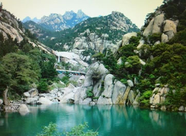 嶗山八水河中游,于百尺懸崖飛流直下,噴珠吐玉,狀如龍舞,故名“龍?zhí)镀佟。潭中碧水凝寒,清澈見底。山雨過(guò)后,洪涌瀑注,飛騰叫嘯,蔚為壯觀。