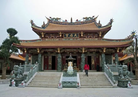 天后宮是天后圣母宮的簡稱,它興修于雍正年間,祭祀海神林默。1938年,天后宮毀于臺(tái)兒莊大戰(zhàn)戰(zhàn)火。今天重建的天后宮,是我國內(nèi)地同類建筑中質(zhì)量標(biāo)準(zhǔn)最高的一座。總建筑面積1508平方米,為二進(jìn)庭院格局。由正殿、左右?guī)俊㈢姽臉堑冉ㄖ䴓?gòu)成。這座建筑,脊飾鏤空灰塑二龍戲珠,線條舒展流暢,木雕精美,彩繪點(diǎn)染,雕梁畫棟,金碧輝煌。