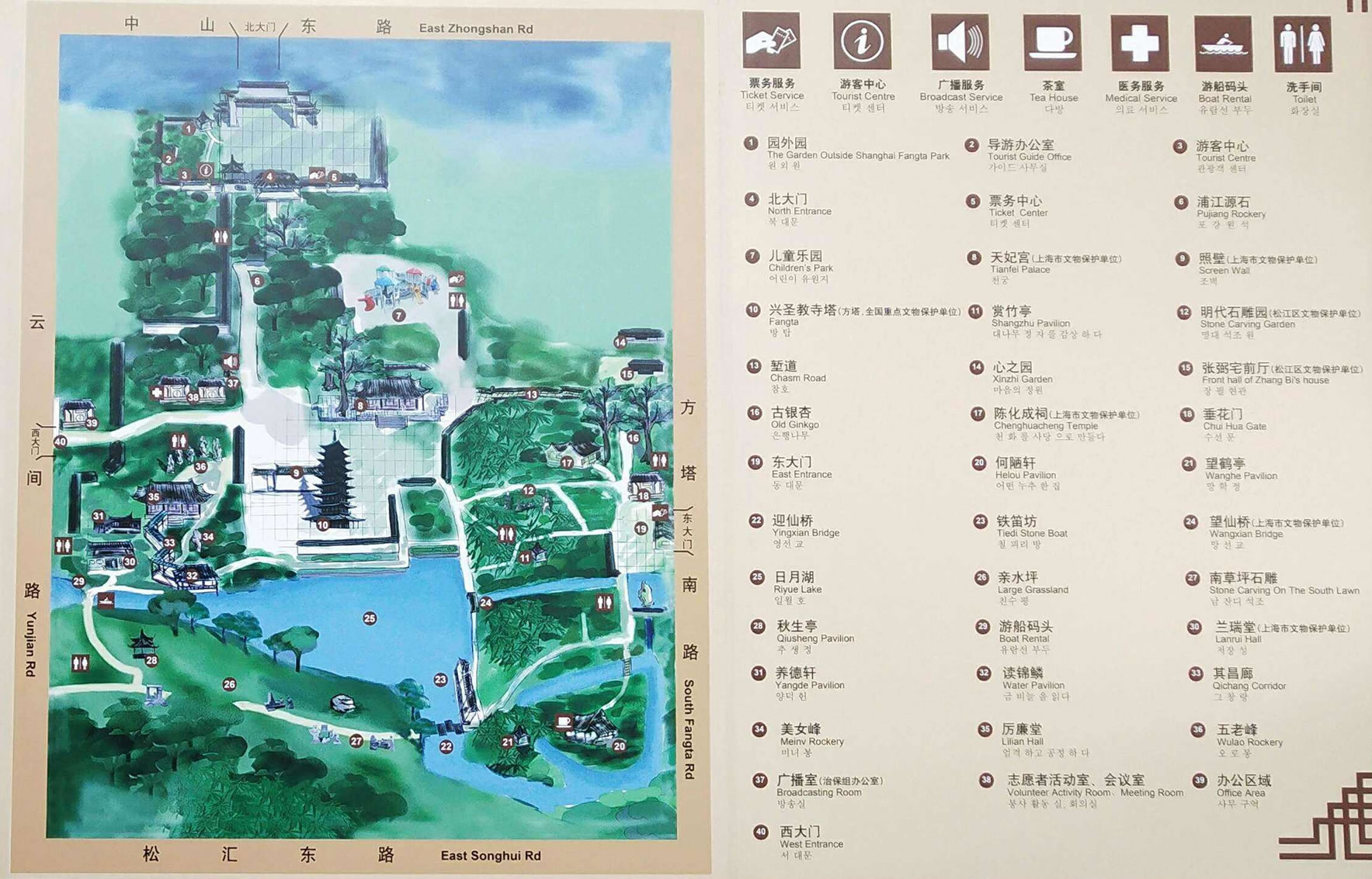 園林以國家級(jí)文物宋代方塔(原名興圣教寺塔)為中心,四周錯(cuò)落著古式建筑群,有市級(jí)文物明代大型磚雕照壁,區(qū)級(jí)文物宋代望仙橋、明代蘭瑞堂(又名楠木廳)、清代天妃宮、清代陳化成祠堂,仿古長廊(內(nèi)有董其昌懷素貼)、古塹道、何陋軒、塔影舫、五老峰等。