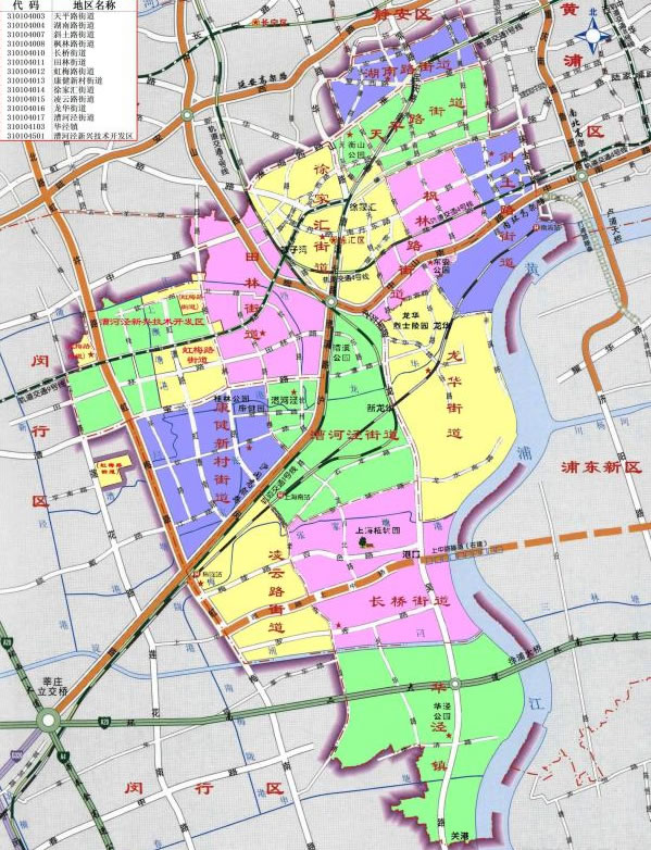 街道:湖南路街道、天平路街道、楓林路街道、徐家匯街道、斜土路街道、長橋街道、漕河涇街道、康健新村街道、虹梅路街道、田林街道、凌云路街道、龍華街道