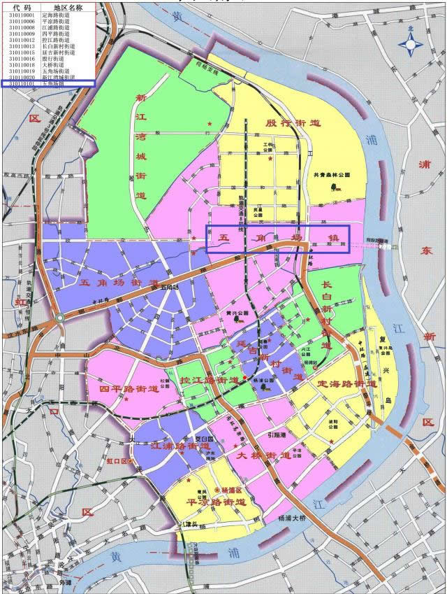 楊浦區(qū)轄12個(gè)街道:定海路街道、平?jīng)雎方值、江浦路街道、四平路街道、控江路街道、長白新村街道、延吉新村街道、殷行街道、大橋街道、五角場街道、新江灣城街道、長海路街道