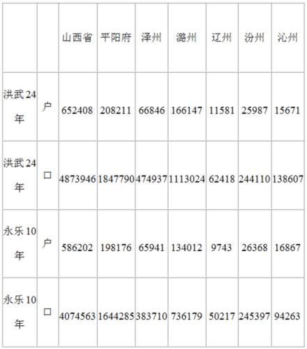 據《山西通志》記載,洪武元年(1368年)到永樂十五年(1417年),被移之民以晉南為多,其次為晉東南、晉中數縣。明代初年,山西省轄5府、3直隸州、16散州、79縣。史書記載的明初移民主要有平陽府轄的28縣,潞安府轄的8縣,汾州府轄的7縣,澤州轄的4縣,沁州簿的2縣,遼州轄的2縣。這些地區(qū)共有51縣,而平陽府就轄28縣。