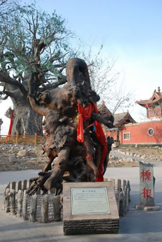 據考古人員鑒定,此根大約生長在宋元時期,距今約1000年左右,遠在明初移民之前;备叨6.2米,其中外露部分4.2米;备P枝錯節(jié),形象奇特,能讓人產生豐富的聯(lián)想,是一棵罕見的大型古槐真根。
