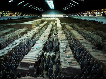 兵馬俑坑位于秦始皇帝陵東側(cè)1.5公里處西楊村南,是秦始皇帝陵的陪葬坑。已發(fā)現(xiàn)三座,分別編為一、二、三號兵馬俑坑。三座俑坑占地面積達(dá)2萬多平方米,內(nèi)有和真人、真馬大小相似的陶俑、陶馬近8000件。有車兵、騎兵和步兵等不同的兵種,排列整齊有序。