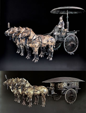 銅車馬是秦始皇的陪葬品之一,象征著秦始皇鑾駕的一部分。銅車馬的形制是模仿實(shí)實(shí)在在真車的形狀。以前考古發(fā)現(xiàn)的車都是木質(zhì)的,出土?xí)r已腐朽,銅車馬的出土使今人能夠清楚地看到古代御用車駕的真實(shí)面貌。銅車馬是按秦始皇御用車隊(duì)中屬車二分之一的比例縮小制成的,車蓋以及車輿內(nèi)外彩繪著精美的紋樣;兩乘銅車馬上的金銀飾品重達(dá)14公斤,顯示了銅車馬高貴的等級。