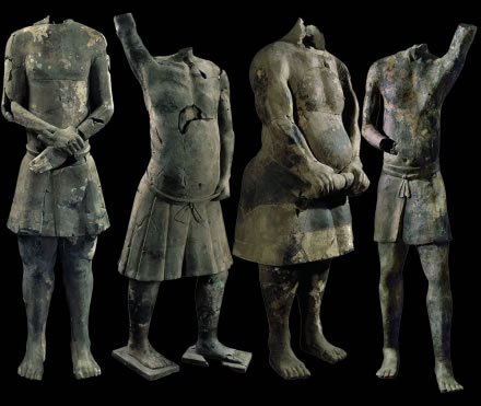 此套展品為秦代的陶器,出土于秦始皇帝陵K9901陪葬坑。一號百戲俑,殘高152.00厘米,右臂有刻劃文字“咸陽親”。三號百戲俑,殘高172.00厘米。四號百戲俑,殘高152.00厘米。十九號百戲俑,殘高181.00厘米。1999年,考古人員在秦陵東南部內(nèi)外城垣之間的陪葬坑內(nèi),試掘出土了陶俑11件,它們上體裸露,下體著裳。動作有直立狀、雙手卷衣狀、一手叉腰一手高舉、雙腿弓箭步、半跪狀等。