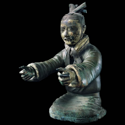 此展品為秦代的陶器,通高51.00厘米,重51.92千克,出土于秦始皇帝陵西側(cè)銅車馬陪葬坑,為秦陵二號銅馬車上的御官俑。御手通體彩繪,頭戴鹖冠,身穿長襦,腰束革帶,下穿長褲,與秦俑坑出土的高級軍吏俑相似,也是具有一定爵位的軍吏。 |