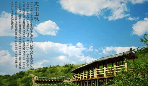 定軍山:定軍山位于陜西省漢中市勉縣城南5千米,三國時期古戰(zhàn)場。為省級風(fēng)景名勝區(qū)。原屬武侯墓鄉(xiāng),今屬定軍山鎮(zhèn)轄區(qū)。三國時,蜀將黃忠斬夏侯淵、趙顒于此,在歷史上遂負盛名。屬大巴山脈,其脈自高廟子入平地,隆起秀峰12座,自石山子至元山子,號稱“十二連峰”,再東為當口寺孤峰,自西向東綿延十多公里,如游龍戲珠,故有“十二連山一顆珠”之譽。主峰定軍山為最高處,海拔833米,山頂原有“古定軍山”石碑,文革被毀,今新立。山南有一個天然鍋底形的大洼,周長1.5千米,即三國時稱為“可屯萬兵”的“仰天洼”。北麓有一片廣漠沃野,就是當年諸葛亮大布“八陣圖”、設(shè)“督軍壇”的武侯坪,黃忠大戰(zhàn)夏侯淵的戰(zhàn)場,時常發(fā)現(xiàn)“扎馬釘”和箭鏃,傳為蜀軍用兵之物;山旁有“斬將橋”,“八角琉璃井”井口八角形,薄頁細花紋漢磚砌成,皆不存。山半腰有一大石,高約3.3米,寬約2米,中開一縫,寬窄不一,名曰“擋箭牌”,傳為諸葛亮遮擋敵箭的遺物。