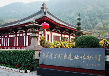 御湯遺跡:1982年4月,華清池內基建時,在今“貴妃池”西側發(fā)現了古建筑基址,省文管會考古隊即開始發(fā)掘考證。用了3年多時間發(fā)掘了約4000平方米的面積,發(fā)現了一條長18米、寬5.1米的唐代蛇形水源通道和4座青石砌成的浴池,還有大殿基址4處,發(fā)現30多米長的石墻和兩處蓮花踏步,總長400多米的陶管水道,長50米的磚砌水道及建筑材料多件。1983年7月,考古工作者在溫泉總源北部發(fā)掘出一個東西長10.6米,南北寬6米,深1.5米。輪廓呈蓮花瓣形的浴池遺址,池底及四周均用青石鋪砌,池內有兩層臺,池底南有兩個圓形水口。專家根據史籍記載華清宮的御池方位、形制、規(guī)模和發(fā)現的浴池四周的大殿基址和柱礎等,認為是唐玄宗使用的九龍殿蓮花湯。1984年10月在緊挨蓮花湯西北處,發(fā)掘出一個保存完好的海棠花形狀的浴池,東西長3.6米,南北寬2.9米,深1.26米,用青石砌成,池內有二層臺階,池底正中有一圓形水口,做工考究,雕刻精細,專家認為是“海棠湯”,即唐玄宗御賜楊玉環(huán)的“貴妃池”。在蓮花湯西南還發(fā)掘出一個東西長5米,南北寬2.7米,深1.2米,用青石鋪砌的長方形浴池。據文獻記載推測,應是“太子湯”。經考證,這些古建筑遺存與史志書記載完全吻合,是一組較完整的唐華清宮建筑遺址,也是華清宮的中樞所在,為唐玄宗和貴妃游幸時活動的主要場所。期已經全面整理,并仿唐形制,建成“唐華清宮御湯遺址博物館”供游人參觀。