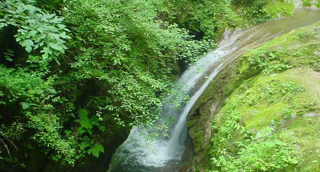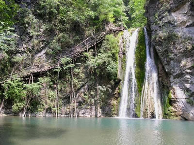 鎖龍瀑布,因瀑布兩邊的山崖,如兩扇厚厚的門,鎖住了去路而得名。租上竹排,沿竹排擺渡之瀑布近處,抬眼望去:瀑布飛流直下,一波三折。瀑布下深潭水平如鏡,潭水清澈見底。