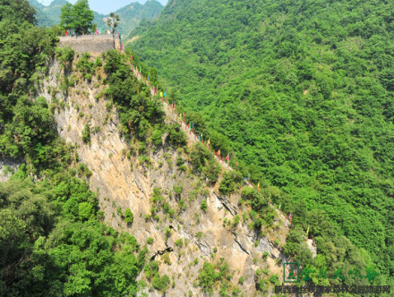 由于通行不便,古人就在崖壁上鑿出小洞,修圓木棧道通往山頂。從山腳下往上看就像是“天梯”一樣。為了安全起見,景區(qū)把過去的“天梯”修成了雙排凌空棧道。