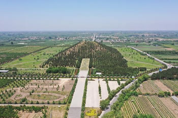 上述與今測量數(shù)字基本相符。總占地面積計為56878.25平方米,封土體積848592.92立方米。陵園四周呈方形,平頂,上小下大,形如覆斗,顯得莊嚴穩(wěn)重。