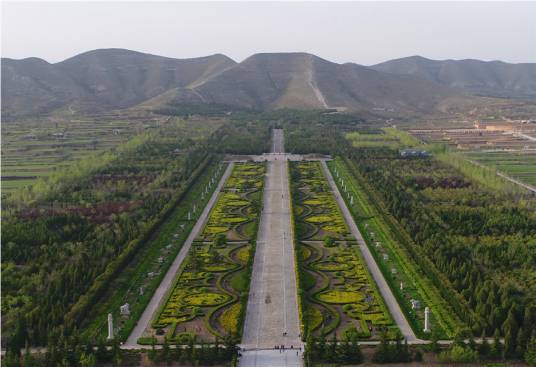 橋陵陵園略呈長方形,東西長2871米,南北長2836米,總面積852萬平方米。四面開辟有門,四角有樓。歷經(jīng)千年風(fēng)蝕雨剝,唐橋陵所保留的石華表、石鴕鳥、石馬、石人、石獨角獸、石獅等五十余尊巨大石刻依然形態(tài)清晰,生動自然,其中的38尊排列在寬達(dá)110米、長625米的神道兩旁。