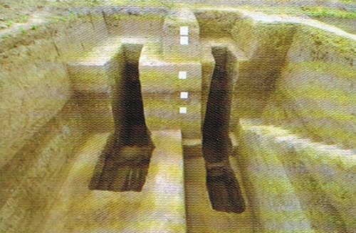 墓地東、西、北部均有圍溝環(huán)繞,形成長321、寬273米南部敞開的南北向長方形墓園。墓葬群位于墓園正中偏北,墓地中軸延長線正南500米處為呂氏家廟“呂氏莊閣云寺”故址。墓葬排列脈絡清晰,中軸線上自南向北縱向貫魚式為長子長孫系列,橫向則按輩份分排布置。墓地使用時間為宋神宗熙寧七年(公元1074年)至徽宗政和元年(公元1111年),共計埋葬五代呂氏族人。