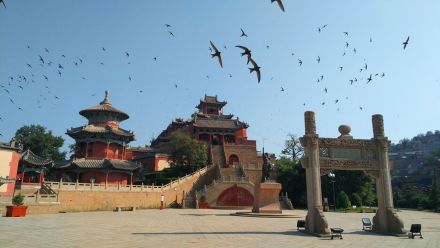 位于米脂縣北的盤龍山上,盤龍山原名馬鞍山,是省級重點文物保護單位。李自成行宮是李自成在西安建立大順國后,其侄李過奉命回米脂修建的。行宮依山據(jù)險,前后2層90級臺階,將秀麗別致的樂樓、梅花亭、捧圣樓、二天門以及凌空而立的玉皇閣聯(lián)結(jié)托起,蜿蜒有序地直上山巔。