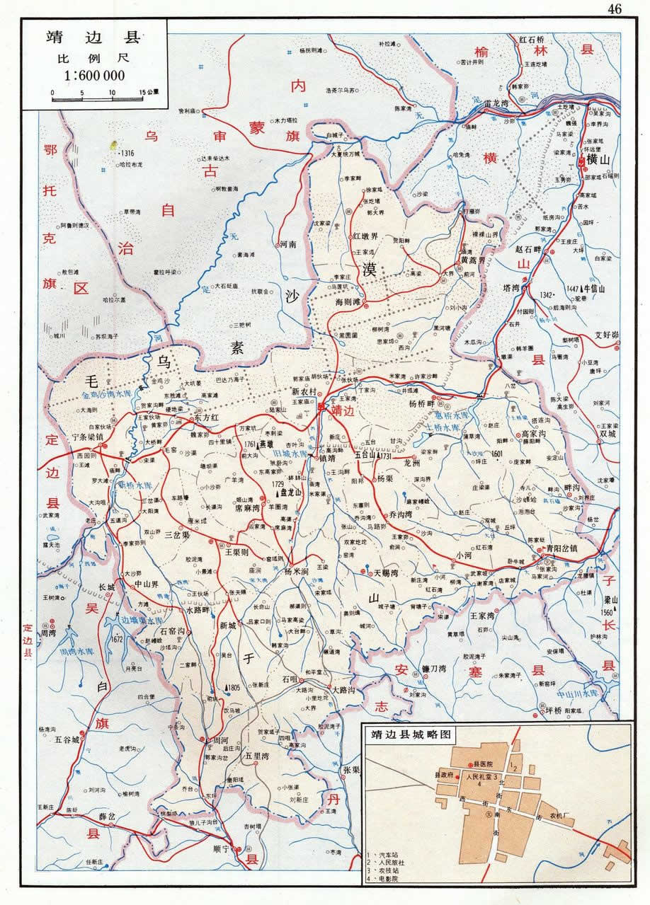 置縣初縣域無(wú)考。清乾隆年間(1736~1795),新城堡為縣城:“東與懷遠(yuǎn)縣清平堡接壤,一百二十里;西與定邊縣柳樹澗接壤,一百二十里;南與保安縣牛頭坡接壤,一百一十里;北至邊墻十里”(乾隆手抄本《靖邊縣志稿》)。光緒年間(1875~1908),鎮(zhèn)靖堡為縣城:“東至崔家畔一百里,與懷遠(yuǎn)縣之狄青原接界;西至二道渠一百一十里,與定邊縣之茶店圾接界;南至黃花池灘二百一十里,與保安縣之柳溝接界;北門外即邊墻,出口至四樸樹六十里,與懷遠(yuǎn)縣之本塔兒梁接界;東南至沈家園子八十里,與安塞縣之平橋接界;西南至闊闊川二百一十里,與定邊縣之侯家岔、甘肅省安化縣之亂石頭接界;東北至毛烏素六十里,與懷遠(yuǎn)縣之許家沙畔接界;西北至史家地坑一百一十里,與定邊縣之二十里塘接界。計(jì)東西廣二百一十里,南北袤二百七十里”(光緒本《靖邊縣志》)。