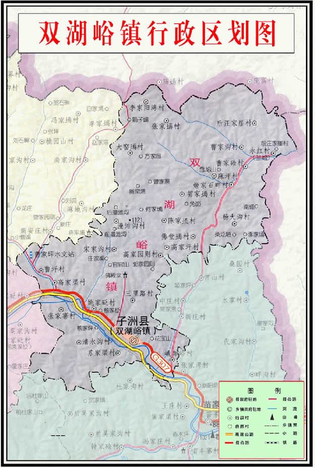 雙湖峪鎮(zhèn)歷史悠久,彭孫貽著《流寇志》載:明代即有西川“雙湖峪”。清乾隆四十九(1784)修《綏德州志》記載、雙湖峪“州西巨鎮(zhèn),又半隸半脂,峪內(nèi)約六、七里,峪南大石碣中有雙泉涌出,味甘冽,昔為風(fēng)。ㄋ祝﹦俚兀辖◤R,從自西向東分二環(huán)流至鎮(zhèn),從橋洞出,入大理河畔,原為綏德縣的一個(gè)大鎮(zhèn),也是大理河畔的一個(gè)重要集市,農(nóng)歷二、七是集日,三月、七月、十月、臘月初二是會(huì)期,商旅往來(lái),甚為繁華。子洲縣成立以后,即為縣城。
