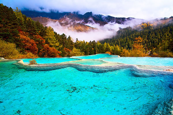 黃龍風(fēng)景名勝區(qū)面積700平方千米,與九寨溝相距100千米,海拔1700~5588米。核心區(qū)域點(diǎn)綴著三千多個(gè)彩池。以結(jié)構(gòu)奇巧、色彩豐艷的地表鈣華景觀為主景,由黃龍溝、丹云峽、牟尼溝、雪寶鼎、紅軍長(zhǎng)征紀(jì)念碑碑園等組成。主要景觀集中于長(zhǎng)約3.6公里的黃龍溝,溝內(nèi)遍布碳酸鈣華沉積,并擁有豐富的動(dòng)植物資源。