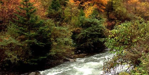 奶子溝:在藏語中是美麗富饒、幸福安寧之意。奶子溝八十里彩林風情谷因身處深谷獨享清幽雅靜的奶子溝而得名,又以美甲天下的彩林世界而聞名。這里植被豐茂,陽光燦爛,氧氣充足,是個天然的大“氧吧”。奶子溝彩林洋洋灑灑長達八十里,蔚為壯觀。樹種主要由樺樹、松樹、柏樹、楓樹和各種喬木組成,還有不同色彩的針葉林、闊葉林、次生林、灌木叢點綴其間,密密麻麻地覆蓋了一坡又一坡。在純凈的藍天底下,紫紅、粉紅、橘紅、金紅、深黃、草綠、黃綠、棕紅、褐色的樹木形成了“萬類霜天競自由”之勢。進入彩林世界你會感覺進了油彩的世界,任你語言學家、色彩學家在它面前都會感到詞匯的匱乏,色彩的蒼白。