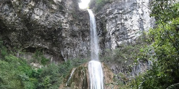 滴 滴水巖,位于固軍鄉(xiāng)火石梁村東南。此地有一小溪為兩山所夾,越往上游山勢越高,坡度越陡。最終于小溪盡頭處兩山合為絕壁,其頂部成“V”字相交。相交處有一股清泉摔落至下方一堅立雞蛋狀的巨石,發(fā)出巨大的聲響。泉水再分為幾綹沿平滑如鏡的石壁滑落至下方深潭!遠遠看去,爬滿暗綠青苔的石壁上像是掛著無數(shù)條白色的絲帶和珠簾!雖景致與沙清河各有千秋,甚至略勝一籌。但因交通較為閉塞,所以知者不多,但來此觀光過的游客無不伸出大拇指一個勁兒地叫好!
