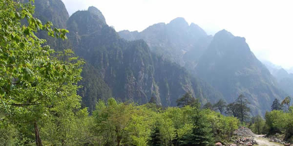 山上的原始森林除了松、杉、樺外,還有珍貴的珙桐、樟和楠木,山上各色野花爭(zhēng)奇斗艷,更有那四季輪流開(kāi)放的三、四十種杜鵑。從山腳往上,一路景色,變化萬(wàn)千.山腳溪水潺潺,岸芷汀蘭;山腰花紅柳綠,草木蔥蘢;高山霜葉片片,層林玉樹(shù)瓊枝,晶花、夏綠、秋實(shí)、冬雪之風(fēng)光于一處,融自然之美景于一山。自道貫通路便可成為一條很好的游山道。