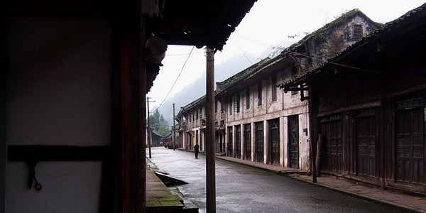 曾家大院 曾家大院位于柳江古鎮(zhèn)北面,通往瓦屋山國家森林公園與玉屏國家森林公園的分道處,建于清朝年間。大院在設計上花了一番苦心,若從空中俯瞰,其平面圖是一個繁寫的“壽”字。繞墻行走,則有犬牙交錯之感。大院由兩個院落組成,一個大門進出,為兩兄弟的共同財產(chǎn),大院有兩塊大的空地,中間是一幢三樓一底中西合璧式的建筑將大院一分為二。 今天的大門處還有一個大石缸,是以前貯水用的。大院內(nèi)共有三個戲樓,方向、形制各異。早已沒有人居住的大院顯得空空蕩蕩,院落里只有幾只老母雞在找蟲吃。環(huán)顧四周,挑檐、樓廊仍然那么精美,整個大院在當年算是一方豪宅了。 最為奇特的是,臨河一邊為了追求壽字的形,其圍墻、房屋的結構如同鋸齒狀,凹凸蜿蜒,顯得非常怪異。那些隨之凹凸蜿蜒的欄桿、房間則顯得神秘莫測,但很協(xié)調(diào),這定然出自民間建筑大師之手。 站在二樓的窗前,往南面眺望,只見峨嵋群峰綿延起伏,輕柔的河風時不時撩亂你的頭發(fā),幾聲清脆的鳥鳴劃破寂靜的氛圍,讓你的想象再度飛揚。 |