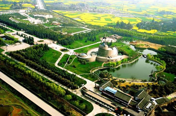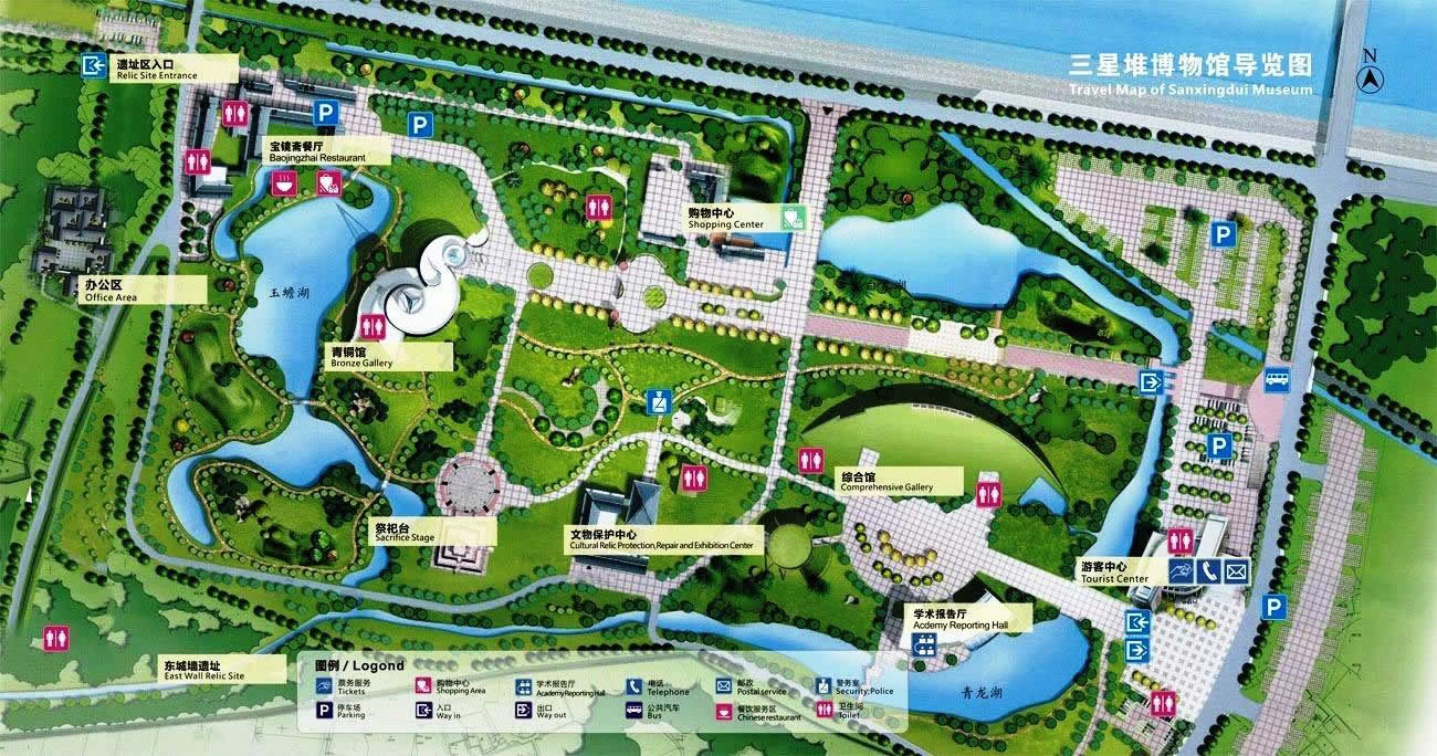 三星堆博物館(Sanxingdui Museum)于1992年8月奠基,1997年10月建成開放,位于全國重點文物保護單位三星堆遺址東北角,地處廣漢城西鴨子河畔,南距成都40公里,北距德陽26公里,是中國一座現(xiàn)代化的專題性遺址博物館。三星堆博物館有兩個展館,其展示面積近12000平方米。