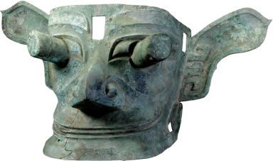 商銅縱目面具:此文物為商代的青銅器,面具呈方型,倒八字形刀眉,眉尖上挑,雙眼斜長,眼球極度夸張;耳尖部呈桃尖狀;鷹鉤鼻,口角深長上揚,似微露舌尖,作神秘微笑狀;下頜前伸;額部正中有一方孔,F(xiàn)收藏于三星堆博物館。