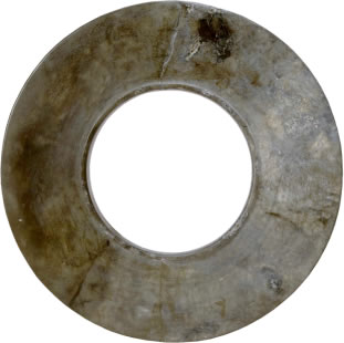 商玉戚形璧:此文物為商代的玉器,平面呈鞋底形,兩面平,邊緣較薄,中部較厚,有一圓形穿孔,孔緣向兩面凸起成高領(lǐng)。凸領(lǐng)呈圓筒形,中腰微向內(nèi)收,F(xiàn)收藏于三星堆博物館。