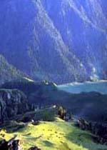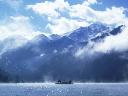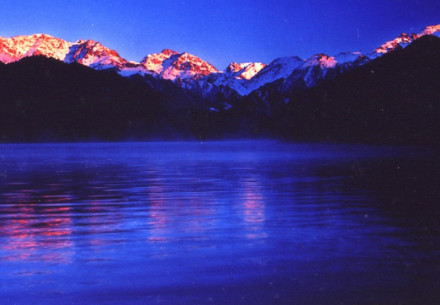 三江河洪水:即“南湖黃龍”,三江河水從大天池南段入湖處,由于博格達山區(qū)夏季降水較多,常暴雨盆潑,三工河上游集水面積有168平方公里,河水每當大雨洶涌北瀉,從天池北南望。