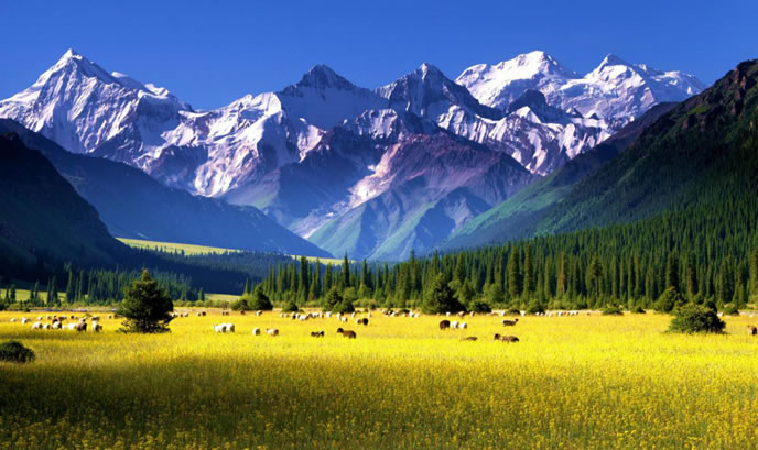 地形地貌 昭蘇縣為中亞內(nèi)陸腹地一個(gè)群山環(huán)抱的高位山間盆地,由于四周高山環(huán)抱,形成了一個(gè)較為獨(dú)特的自然生態(tài)環(huán)境,海拔在1323米-6995米之間。南部為天山主脈,山勢(shì)雄偉,高峻綿亙,是阻擋南疆沙漠干熱風(fēng)的天然屏障;北部為烏孫山,呈東西走向,山體較矮;西部受沙爾套山以及哈薩克斯坦境內(nèi)查旦爾山的阻隔,形成一個(gè)南、西、北三面高,東部略低的盆地。山地、丘陵與平原之比為4∶1。號(hào)稱“天山之父”的汗騰格里峰,位于西南部的中哈邊境線上,海拔6995米,是天山山脈第二大高峰,終年積雪區(qū)達(dá)100平方公里以上,是特克斯河的主要水源。是新疆境內(nèi)唯一一個(gè)沒有荒漠的縣。