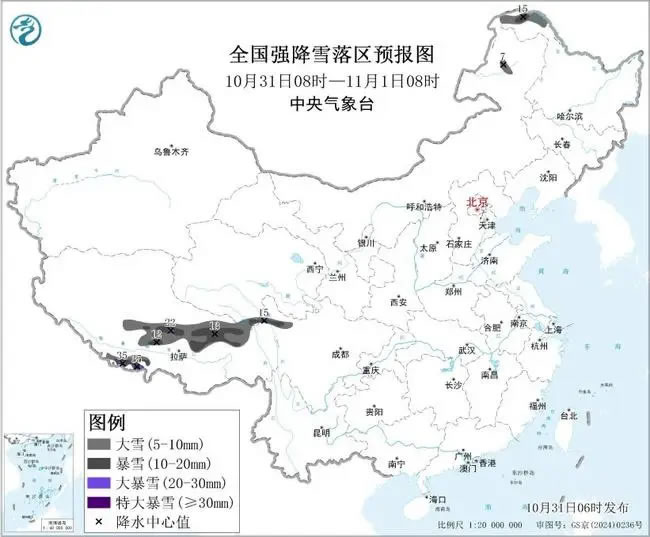中央氣象臺10月31日6時繼續(xù)發(fā)布暴雪藍(lán)色預(yù)警:預(yù)計10月31日8時至11月1日8時,西藏中東部和西南部、川西高原北部、黑龍江西北部、內(nèi)蒙古東北部等地部分地區(qū)有大到暴雪,其中,西藏中部局地有大暴雪,西藏西南部局地有大暴雪或特大暴雪(30~35毫米)。上述部分地區(qū)新增積雪深度4~8厘米,山區(qū)局地可達(dá)15厘米以上。