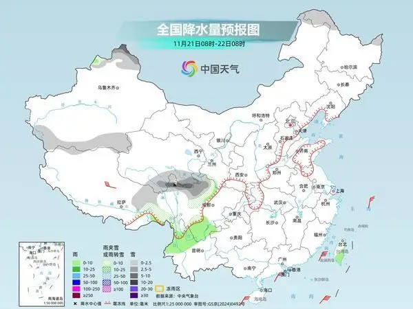 今明天,受弱冷空氣影響,新疆北部、甘肅西部一帶雨雪逐漸增多。特別是明天,也就是小雪節(jié)氣第一天,新疆、甘肅等地雨雪范圍廣,新疆北部沿天山一帶還將出現(xiàn)大到暴雪。同時,青海南部、西藏東北部、四川西北部一帶也將有降雪。