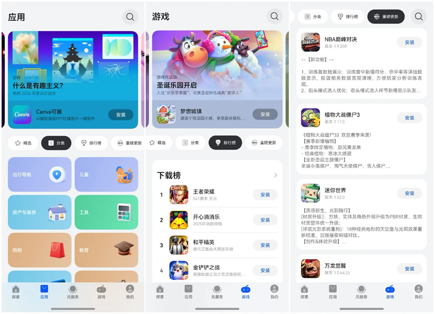 體驗路徑:打開AppGallery,在“應(yīng)用”或“游戲”頁,點擊腰部的“分類”、“排行榜”或“重磅更新”查看