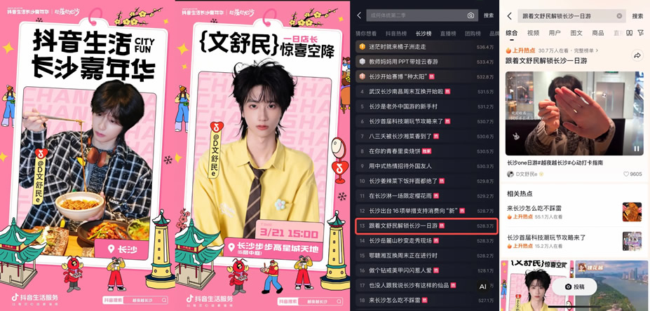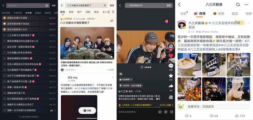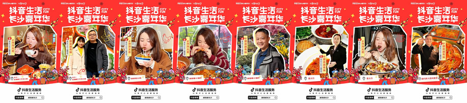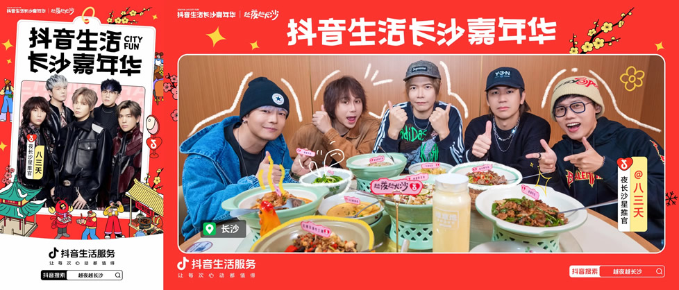 更值得一提的是,憑借城市強力宣傳資源,八三夭團隊首次與抖音生活服務達成合作,借著樂隊新發(fā)專輯的熱度,打造了一支趣味十足的湘菜探店視頻。視頻中,八三夭成員沉浸式品嘗長沙湘菜,被地道風味狠狠圈粉,相關內容不僅鋪滿長沙熱門湘菜綠草地重點商圈的抖音物料,更成功上榜長沙城市熱點#八三夭被長沙湘菜香到了,讓湘菜味道借著明星熱度,飄進了萬家燈火中。