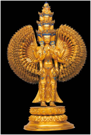 西藏本土制造的宗教文物,以金銅造像最著名。羅布林卡興建之初,七世達賴為給剛建好的宮殿佛堂添裝佛像及佛教用具,曾在布達拉宮腳下建立了一所名為“雪堆白”的造像場,匯集了藏區(qū)內幾百名能工巧匠,在這里精心打造各種佛像器物,以滿足拉薩及周邊地區(qū)寺院的需求。羅布林卡從初建到最后完善,每座佛堂里的大小佛像都被指定由“雪堆白”工匠量身定做打造。除此之外,園內很多佛龕、宗教用具、金頂屋檐、門楣雕飾等,也都出自“雪堆白”工匠之手!把┒寻住痹煜裉攸c是制作精細、比例勻稱、色彩鮮明艷麗,佛像上的鍍金厚重,鍍金面光潔度高,佛冠、耳墜、臂釧、手鐲、飄帶等飾物,一律用綠松石鑲嵌。這些明顯特征,說明18世紀中葉以后,西藏本土佛像打造技術已步入了獨立發(fā)展的成熟階段。