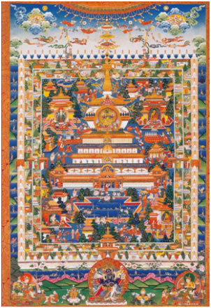 除佛像、佛塔外,唐卡收藏也是一大亮點。羅布林卡珍藏了大量18到20世紀勉唐畫派、欽則畫派和嘎赤畫派的各類作品。早期唐卡著名的有覺仲師徒像、帕木竹巴·多吉杰布像、印度尊者比瓦巴、那若巴像。其中覺仲師徒像唐卡,描寫的是印度尊者,噶當派始祖阿底峽向貼身弟子仲敦巴(師徒合稱“覺仲”)傳授佛法的故事。畫面中心主尊阿底峽頭戴錐形遮耳帽,身披袈裟,雙手結說法印,給身旁仲敦巴講法,仲敦巴著藏式袍服,結跏趺坐,側身聆聽大師教誨。畫面上、下分別繪有如來、藥師、觀音、度母諸佛及繪畫施主像,人物刻畫逼真、栩栩如生,背景以朱砂填色,輪廓用金線勾勒。這件13世紀繪制的“赤唐”作品,十分稀有,彌足珍貴。另外,在收藏諸多的嘎赤畫派作品中,以84位印度大成就者唐卡最具特色。這些唐卡的畫面,不同以往其他畫派作品,構圖較為簡潔,色彩淡雅。人物形態(tài)被描繪的極為夸張,塑造了一個個特殊而詼諧逗趣的大成就者形象。這種一反常態(tài)的畫風作品,在外邊難得一見。還有以唐卡形式繪制的《四部醫(yī)典系列掛圖》,收藏也比較完整。系列掛圖,藏族稱為“曼唐”,它是以彩色連環(huán)畫形式系統(tǒng)描述了藏醫(yī)藥學的基本理論,人類解剖構造,生理功能、疾病診斷治療方法,各種藥物種類以及人類如何養(yǎng)生保健、飲食搭配等內容!奥啤敝谱魍晟朴谇宕迨肋_賴喇嘛阿旺洛桑嘉措執(zhí)政時期。最早成79幅,1916年十三世達賴喇嘛令人又增補了一幅“歷代西藏名醫(yī)圖”,形成80幅。這批系列掛圖,被視為標準藍本,完整保存在羅布林卡內。
