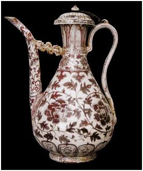 明洪武時期(公元1386年--1398年)贈送的釉里紅牡丹紋執(zhí)壺,高37cm,足徑11cm,這是一件造型端莊美觀大方、繪工精細、十分鮮見的瓷器。由于釉里紅瓷器燒制難度大,成品率低,在現(xiàn)今中國內地保存數(shù)量已很少,而在西藏能完好保存這件瓷品長達600多年,實屬難得。