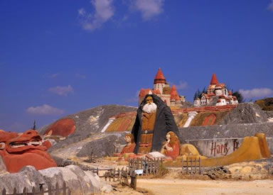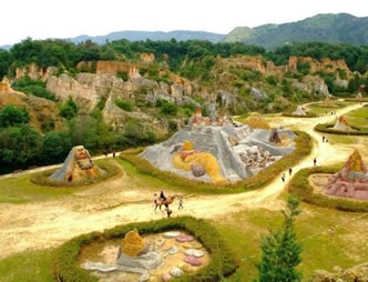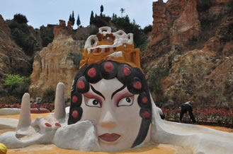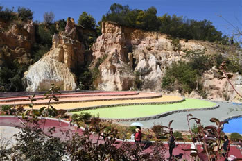 以沙成林,歷經千古的沙林,必為一“怪”。眾峰參差,形異神幻,必是一“奇”。七彩紛呈,流光溢彩,妙筆在天。沙內滲泉,甘露長漣,滋沙養(yǎng)人。風沙不揚,水沙不染,冥冥費解。依山臨湖,磅礴氣概,天地奉獻。這寰于一絕的奇景,吸向性,潛在力,輻射度,都具有特殊價值,憑借這一世界獨有的資源優(yōu)勢,借助沙雕藝術魅力,經過精心策劃,認真組織,于2001年至今成功舉辦了五屆主題分別為“千年夢幻”、“走進名著”、“五洲風采”、“音樂神采”、“爨史風情”的全球首創(chuàng)、世界唯一的國際彩色沙雕節(jié)暨沙雕大賽。