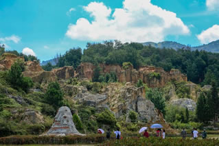 該沙林因風化剝蝕而成,為層巒壘峰狀;又因其以紅、黃、白為主色調,雜以青、藍、黑、灰色,加上季節(jié)、氣候、日照及觀賞角度的不同,產生絢麗多彩的色調,故名彩色沙林,是著名的地質旅游景觀。