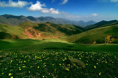 草甸、鮮花、小溪、藍(lán)天、白云、羊群,構(gòu)成了一幅優(yōu)美迷人的圖畫(huà)。
