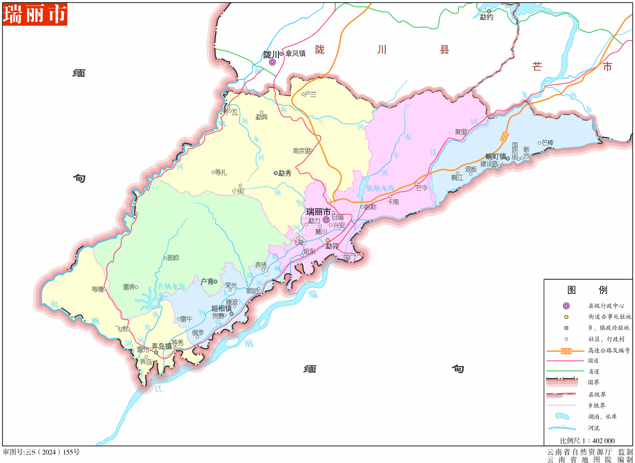 瑞麗市轄1個(gè)街道、3個(gè)鎮(zhèn)、2個(gè)鄉(xiāng):