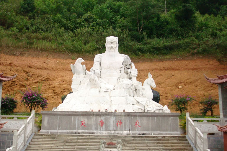神農祠:位于雙江自治縣勐庫鎮(zhèn)北部南勐河上游,勐庫大雪山萬畝野生古茶樹群落山腳的古茶谷中心地帶。祠內塑有一尊采用雪花白石雕制而成的炎帝神農塑像,高9.5米,基座9米,寬4米。對稱建有兩間傳統(tǒng)民族風格房屋,左為茶展館(以茶之源、茶之魂、茶之歌三個方面用54張圖片展示雙江勐庫大葉茶原生地形象和茶葉產業(yè)發(fā)展情況),右為茶藝館(在墻體上精心制作一幅反映雙江拉祜族、佤族、布朗族、傣族飲茶習俗為主的壁畫,高2米,長13.8米)。塑像基座四周及中心廣場共鋪貼大理青石板530.9平方米,從神農祠牌坊至炎帝神農塑像共有69級臺階。