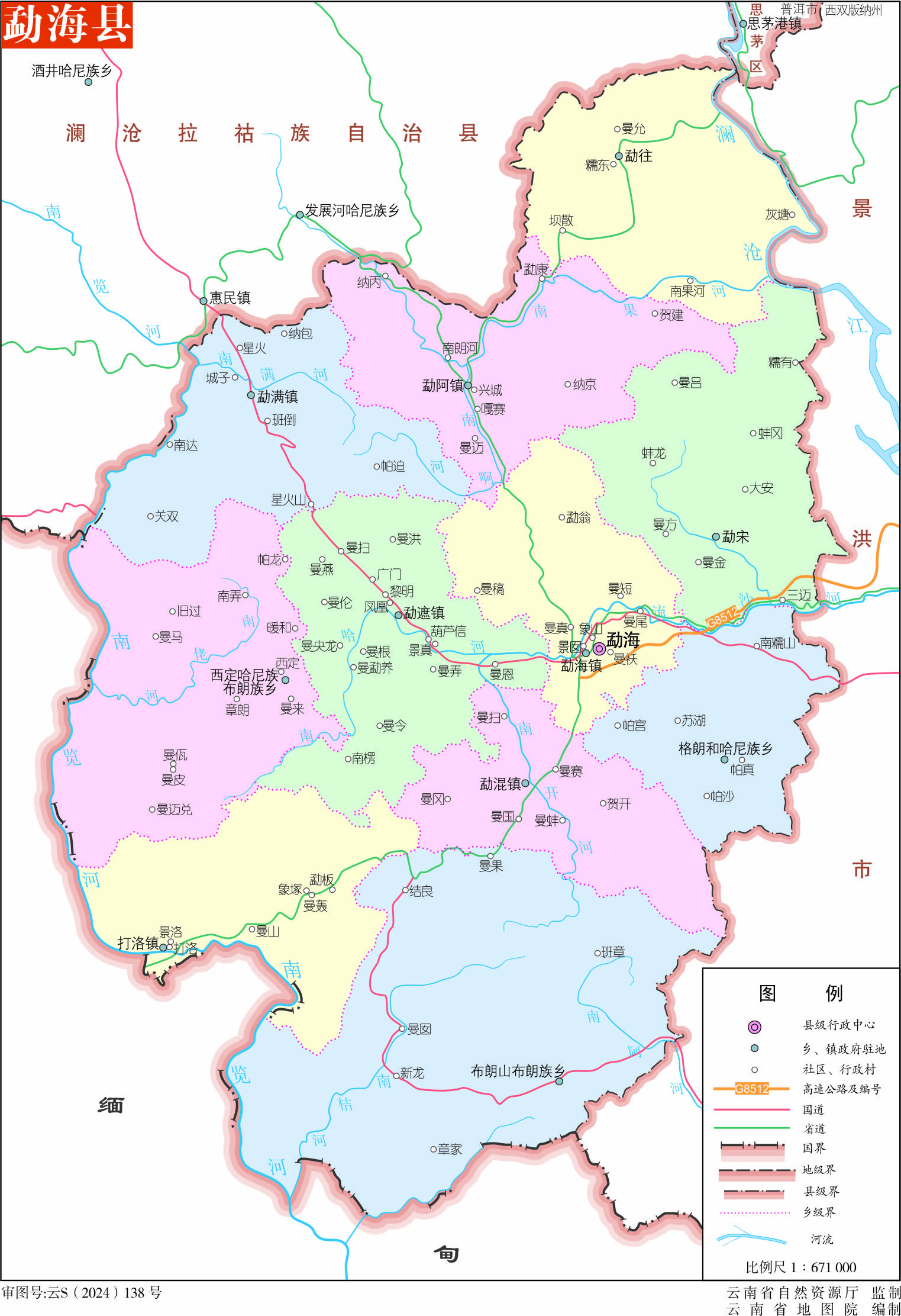 鎮(zhèn):勐海鎮(zhèn)、打洛鎮(zhèn)、勐遮鎮(zhèn)、勐混鎮(zhèn)、勐滿鎮(zhèn)、勐阿鎮(zhèn)