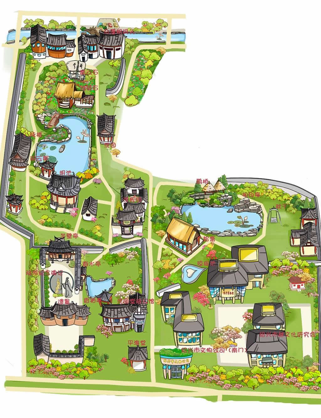 植物:沈園共有68種植物,包括了喬木、灌木、藤本和水生植物各個類別。種植密度以東苑和北苑較大,主要用來對苑內(nèi)空曠地帶進行補充,彌補線路上建筑數(shù)量少而在立面和平面上形成的空隙;東苑還設(shè)置了一小塊杉木林帶,疏密相間。