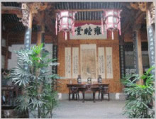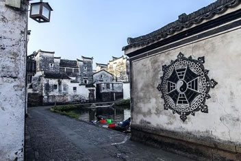 鐘池四周伸展出八條小巷,特點各個不同,形成了坎、艮、震、巽、離、坤、兌、乾八個部位。大公堂就在它的坎宮部位,從它的正門邊上東而去的一條十分幽深,一層層的臺階上坡,左側(cè)是綠蔭如蓋的園子,的一右側(cè)是一排排住宅的后墻,這條巷是通往村中十八廳堂之一的積慶堂的。鐘池東面條巷子很平直,100米長。八條小巷似通卻閉,似連卻斷,虛虛實實,猶如一張蜘蛛網(wǎng),又宛如一座迷宮。